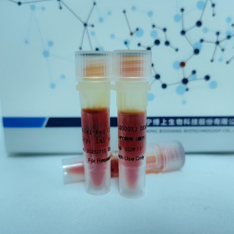 GelRed是一种嵌入型核酸染料,通过静电及电荷相互作用紧密结合到核酸上,能够发出明亮的荧光信号。在琼脂糖凝胶或聚丙烯酰胺凝胶中,GelRed能够高效地对双链DNA(dsDNA)、单链DNA(ssDNA)或RNA进行染色,便于后续的成像和分析。这一特性使得GelRed在分子生物学、遗传学、基因表达分析等领域得到了广泛应用,成为科研人员不可或缺的实验工具。